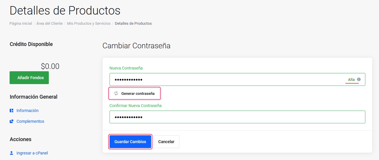 Si la nueva contraseña es suficientemente compleja te lo indicará con un color verde y verás su complejidad a la derecha. Save the password by clicking 'Save Changes'.