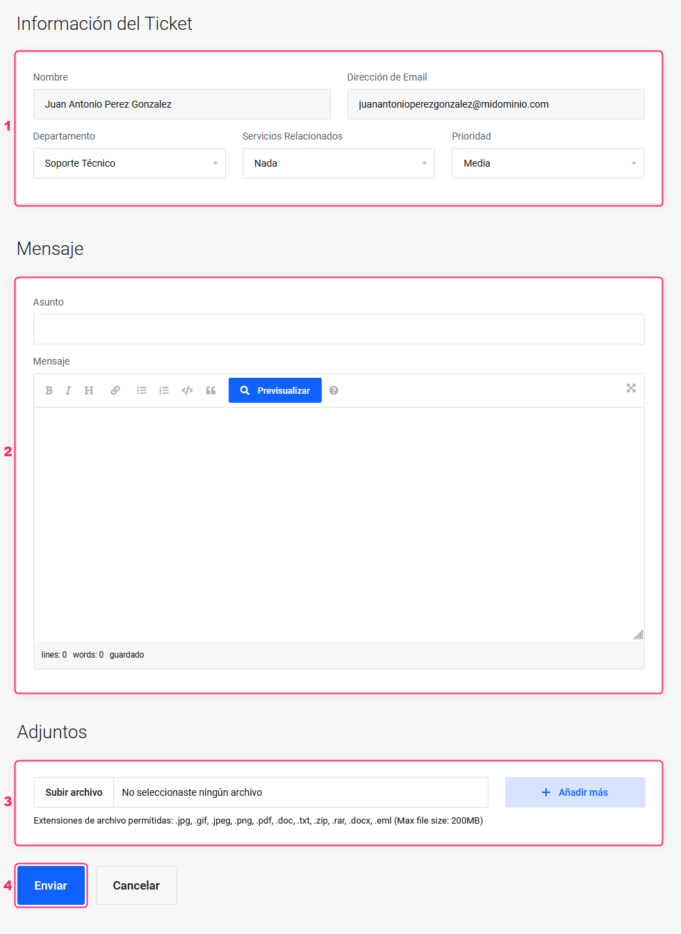 1. When opening a ticket, you'll see your details, the department, service, and response priority
