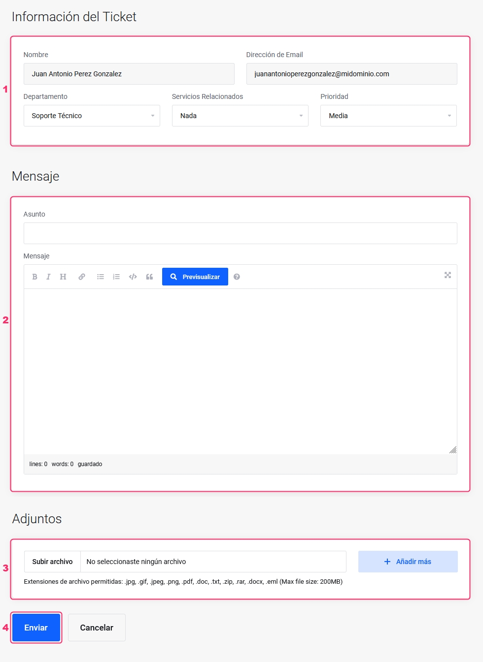 When opening a ticket, you'll see your details, the department, service, and response priority