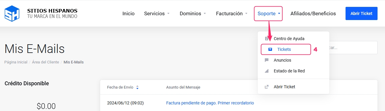 Support tickets are queries you can start from your Client Area. Each response will be sent to your email, and you can continue the conversation by replying to the email or checking the ticket in your Client Area. Follow these steps to open a support ticket: