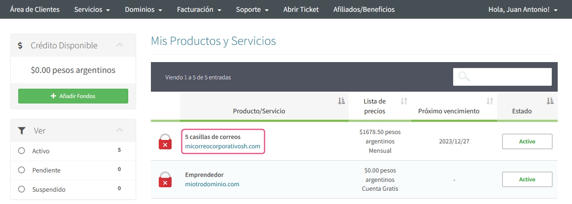 Look for the Corporate Email plan in the list of contracted plans, click on the name of your plan.