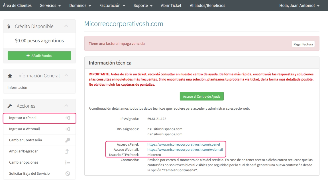 On the new screen, in the Actions box on the left, you will see the option to access the cPanel control panel of your plan.