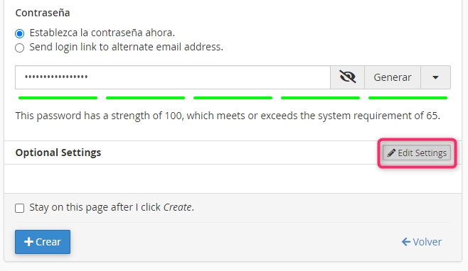 In the account creation form, you can modify some parameters of your new mailbox, for example, the maximum disk space you can use. You can find these options by clicking the Edit Settings button in Optional Settings.