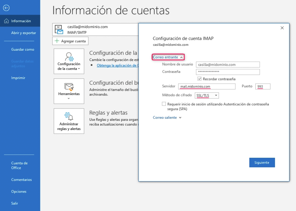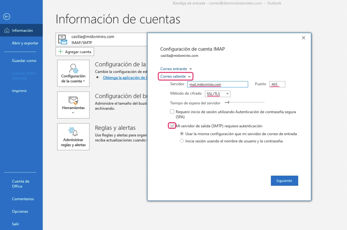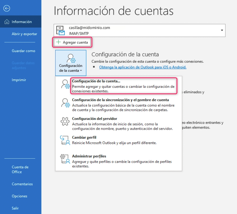 Open your Outlook email client. In Account Information, you can create a new account or modify an existing account.