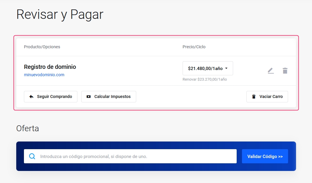 In the Price/Cycle selector, you can modify the number of years you will register the domain until its next expiration. If there is any error in the domain registration process, you can cancel it with the Empty Cart button.