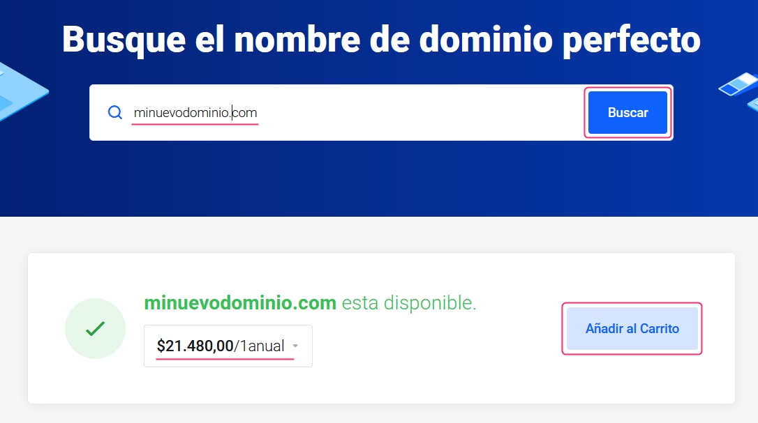 This will take you to the domain registration portal. Repeat the search for your domain in the search bar. If the domain is available for registration, you will see its annual registration price. Click the Add to Cart button to continue.