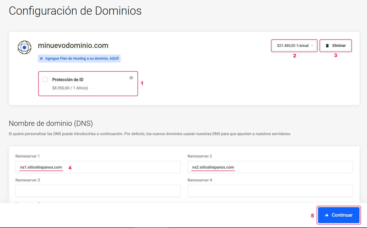 On the new screen, you will see the add-ons available for the domain. ID Protection will hide the contact details of your domain. On the right, you can choose different registration cycles or delete the order if there is any error. Below, you will see the DNS to delegate to the domain. Our DNS will be automatically configured, but you can change them to any other. Once you are ready in this section, click the Continue button.