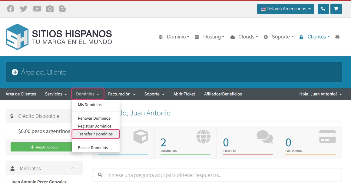 To initiate a domain transfer, log in to your Client Area, then open the Domains menu and select Transfer Domains.