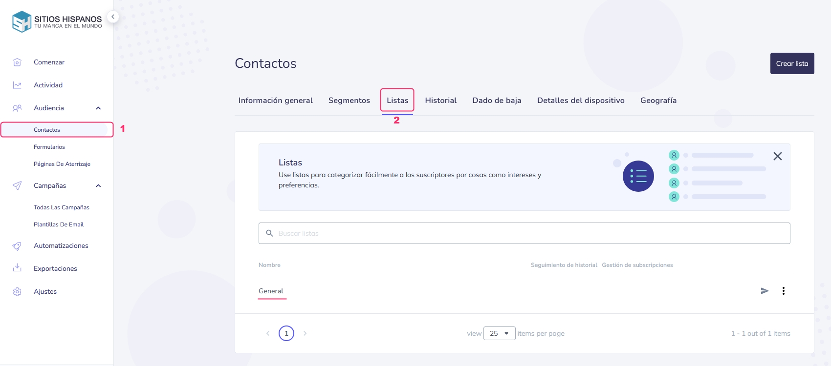 Once you have created your contact list, you can view it by going to Audience => Contacts, then to Lists, and in the center of the screen, you will see all your contact lists. You can access each one to view the contacts it contains and add new ones.
