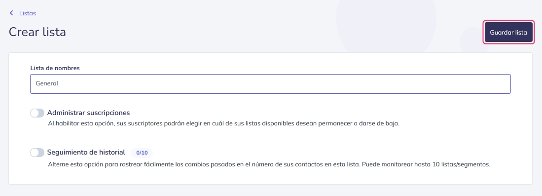 Creating a contact list is quite simple. You will be asked for a name and given options related to list management. At the top right, you will see the button to save the new list.
