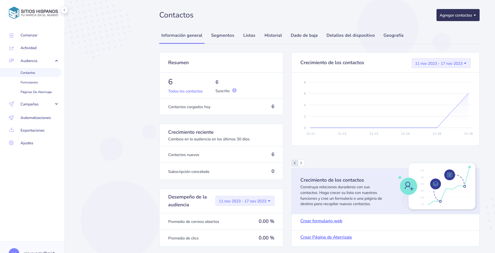 By accessing **Audience => Contacts** you will see, within **General Information,** the metrics, statistics, and summaries of the activity of your contacts.