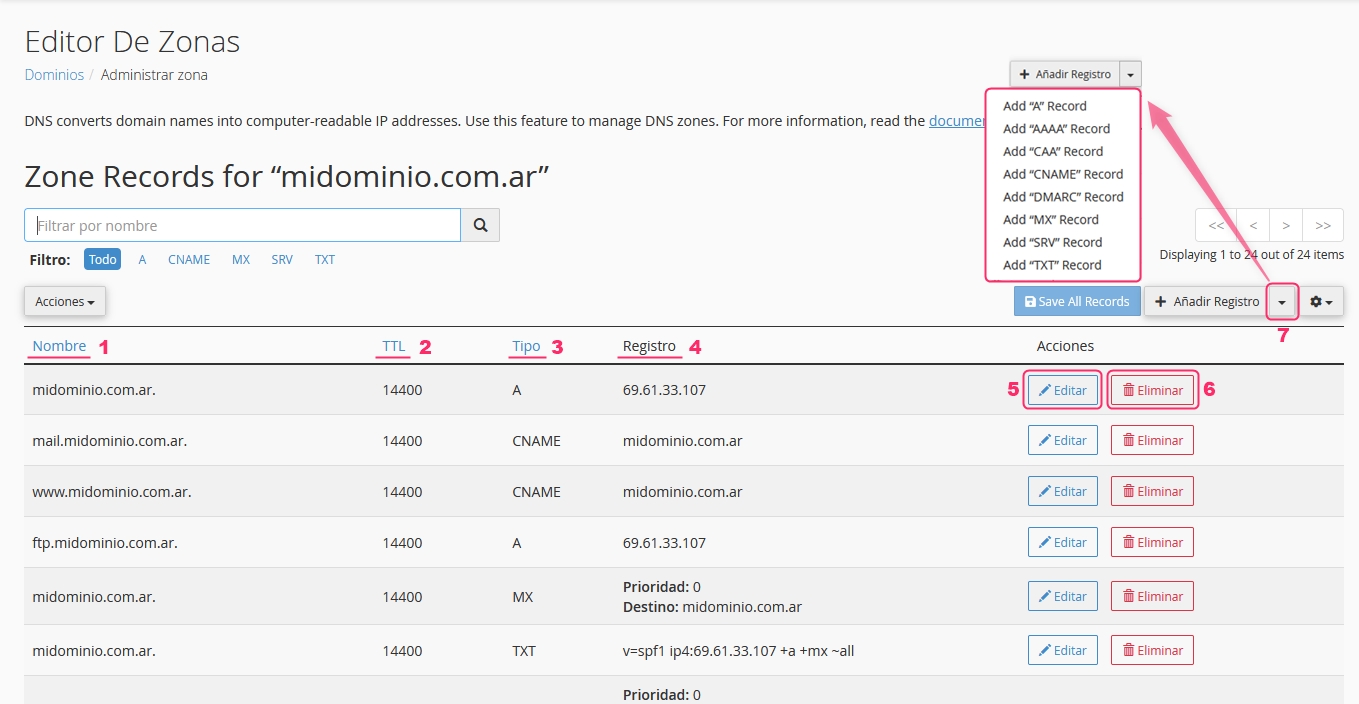You will enter the DNS Zone editor. In this screen, you will see various data that you need to be aware of: