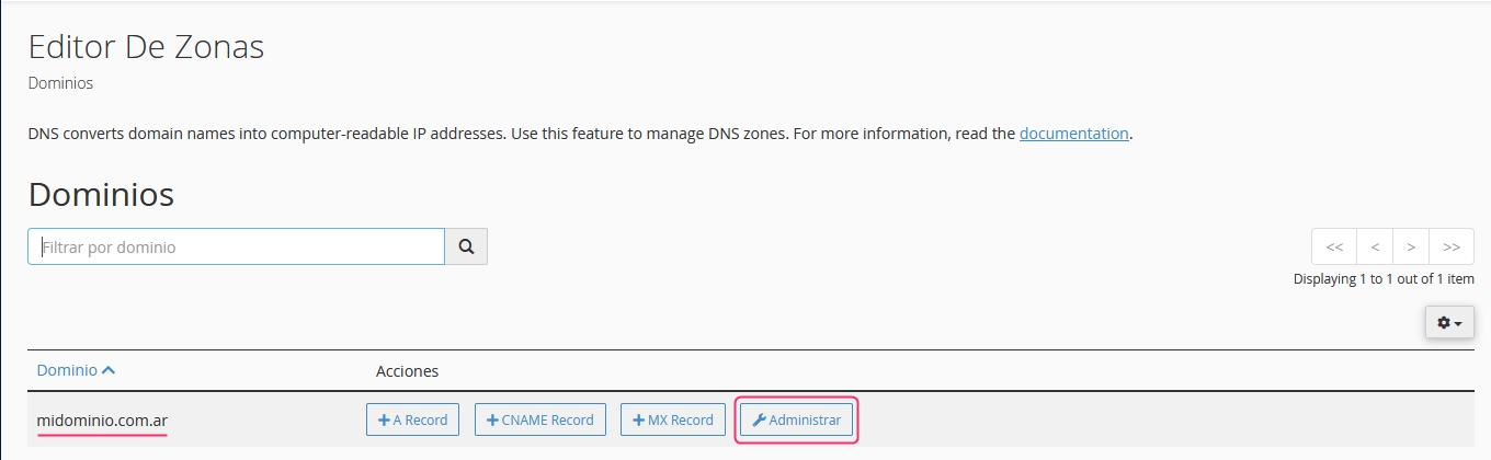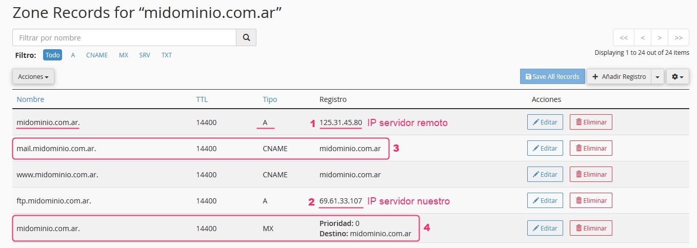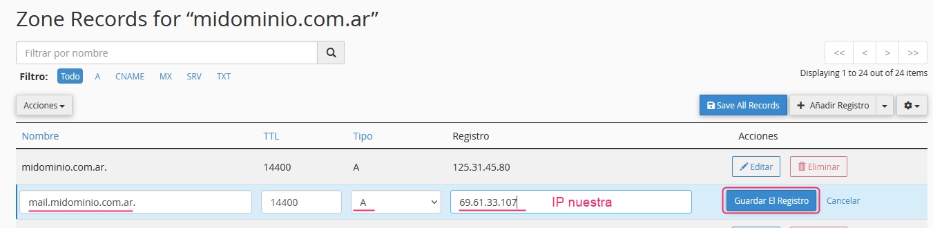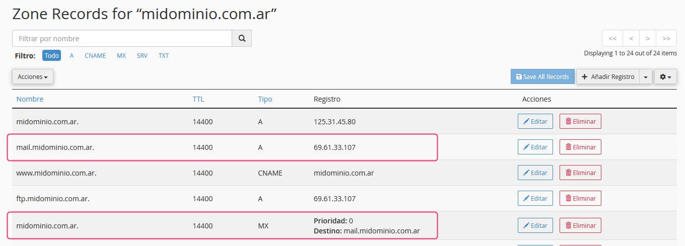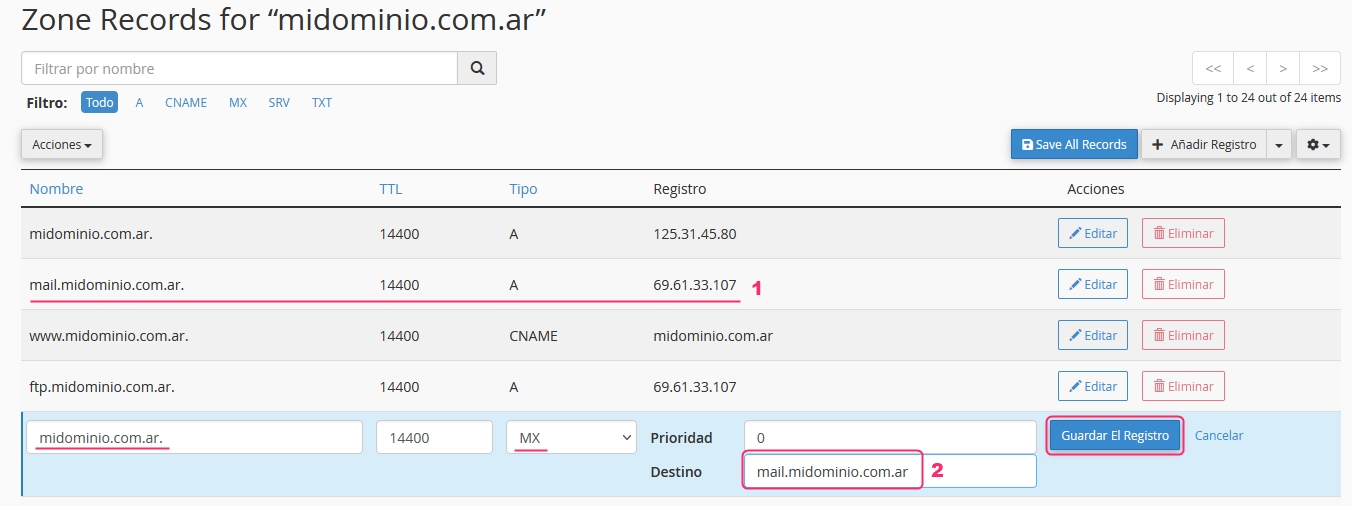 Now, you need to modify the MX record, where you have to change the main domain to mail.midominio.com.ar