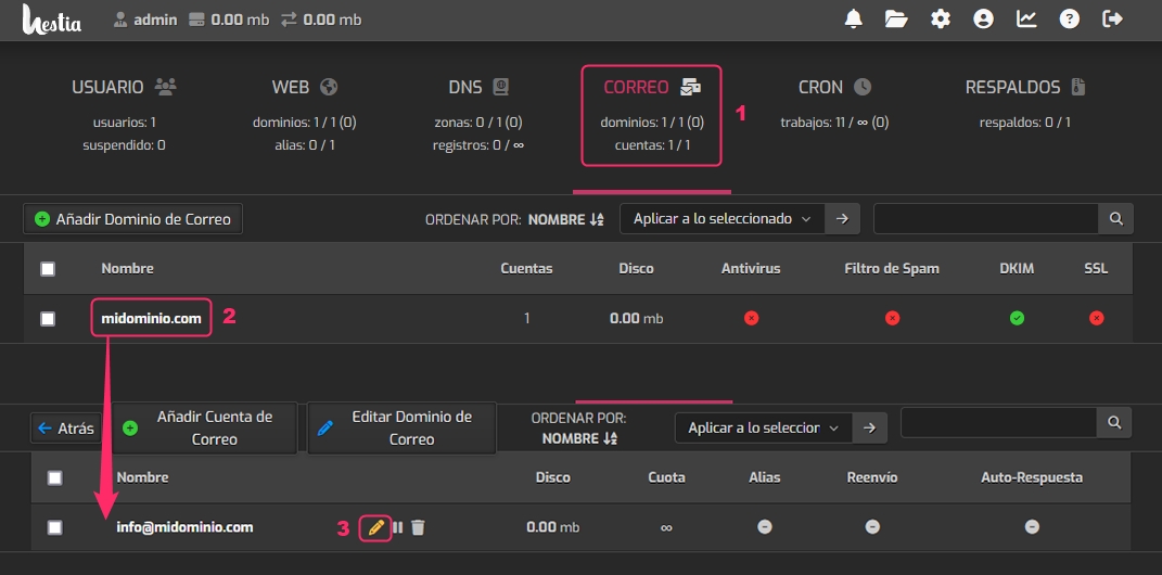 If you have a mailbox created and want to modify any of its parameters, such as its password, the limit of emails per hour, etc., you can do so by following these steps: