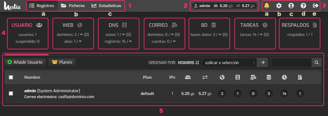 In this section, we will see several options: a. Notifications: This option will display notifications and alerts generated by the control panel. b. Settings: From this option, you will access the global server configuration. c. User: This option will allow you to change various aspects of the control panel, such as the access password, theme, language, etc. d. Help: You can access the documentation of the control panel from this option. e. Exit: From this option, you can exit the control panel.