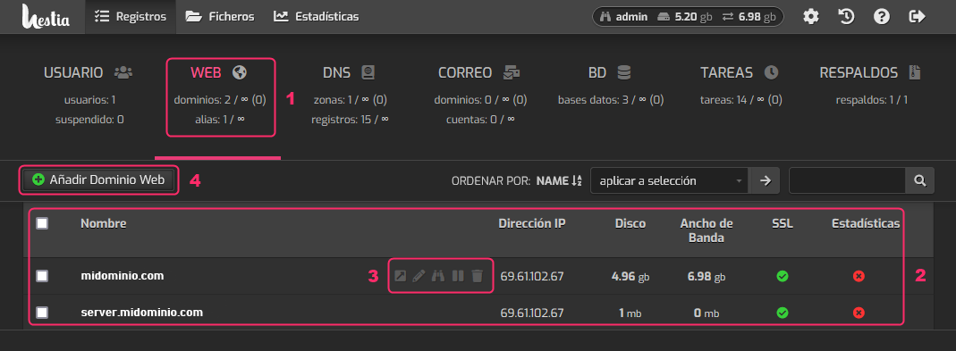 4. At the top left, you will find an **Add Web Domain** button which you can use to create a new hosting account.