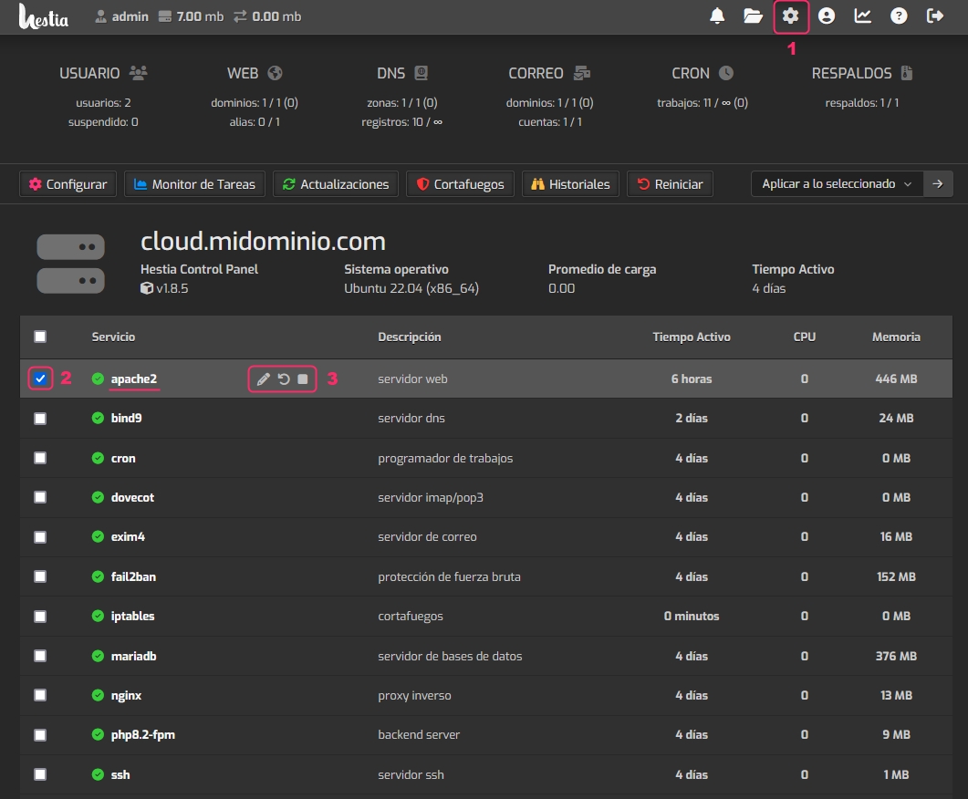 From the list of main services, select the one you want to affect by checking the box on the left.