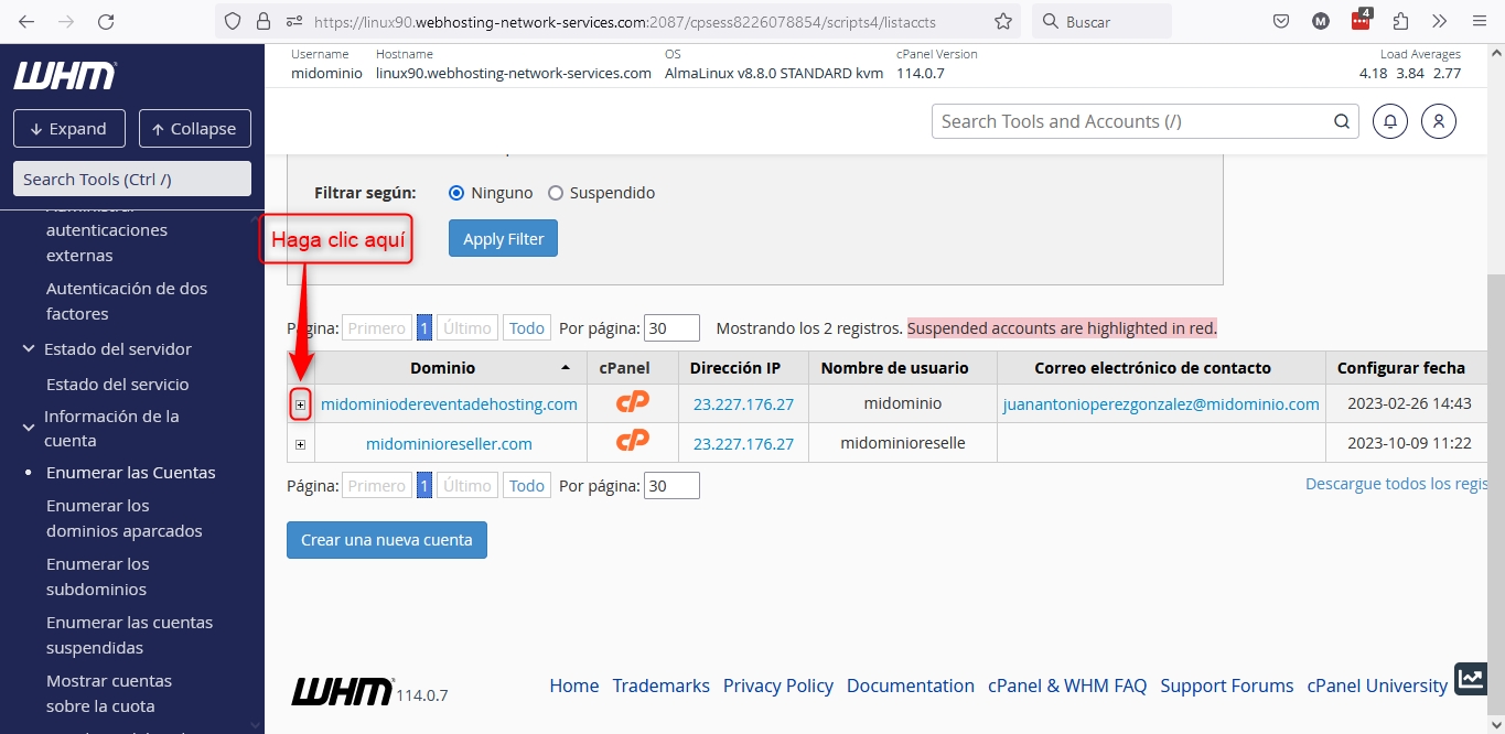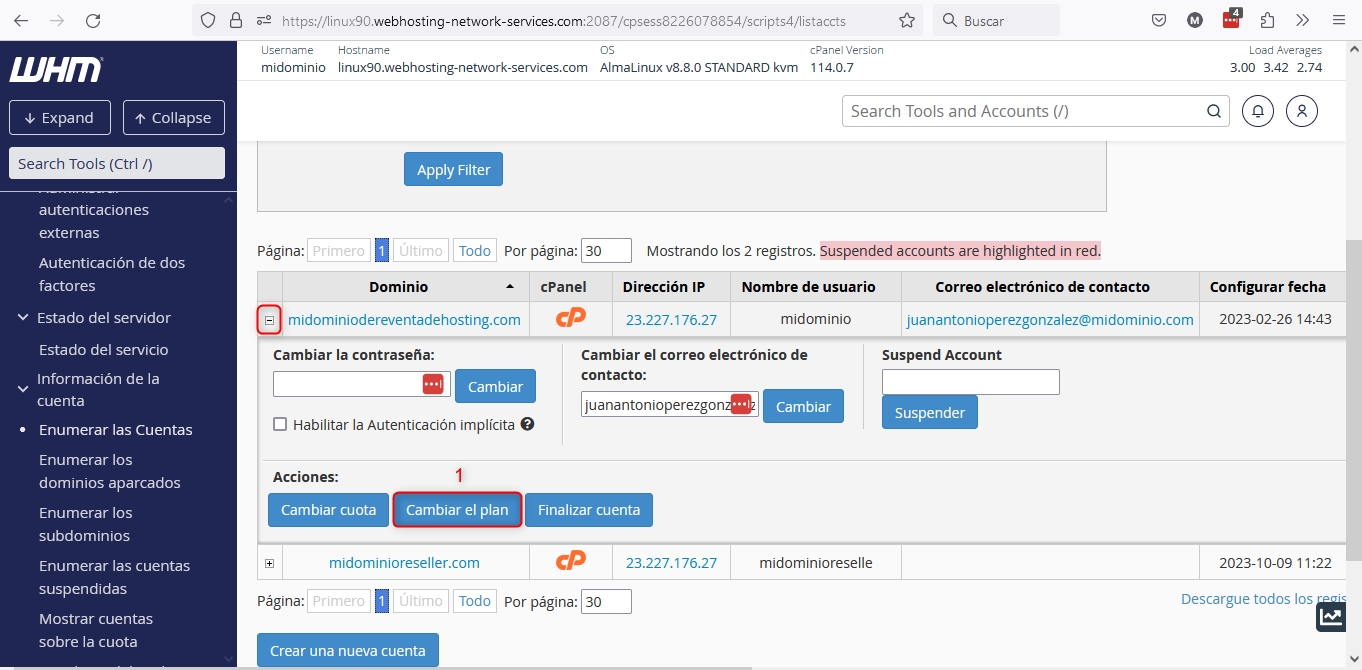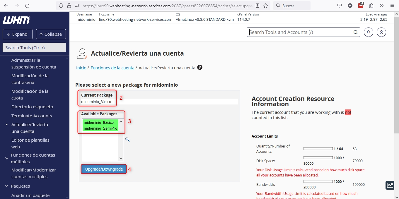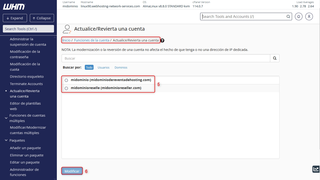 After accessing the WHM of your Reseller plan, you have two ways to get to the instance from where you can change the plan or package of a domain in your Reseller plan.