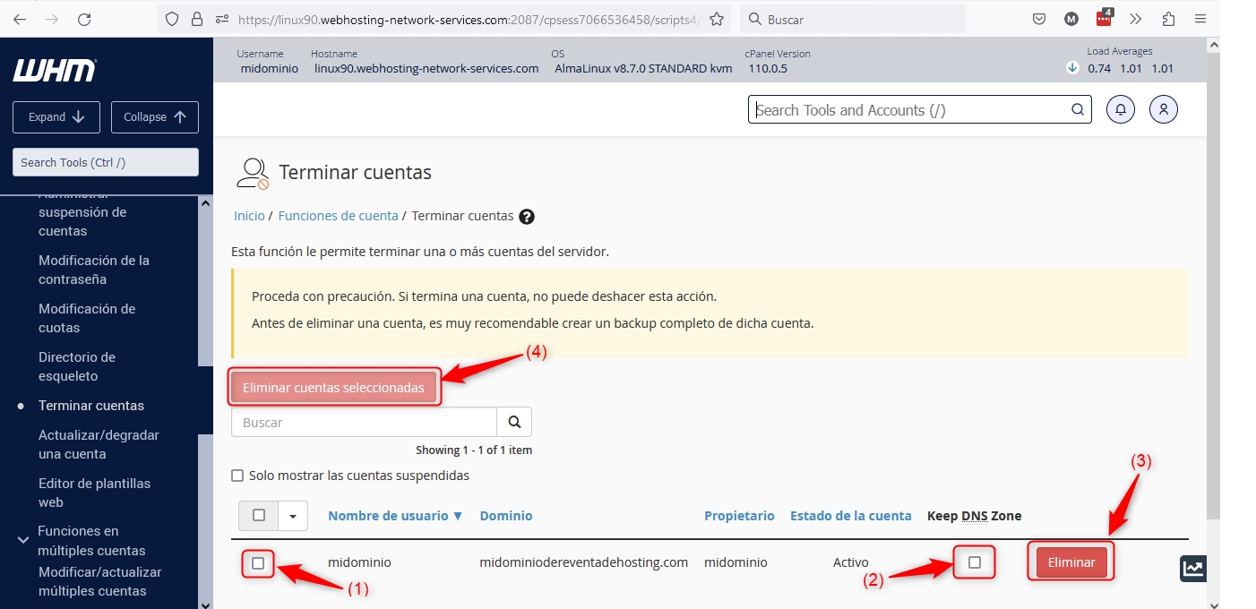 (2) => Here you will choose whether to keep or not the DNS zone of the site on the server after deleting it. If you keep the DNS zone, you will not be able to recreate the site in your WHM until it is deleted (*). This applies to creating the site with its own cPanel or creating it as an addon domain or ALIAS in the cPanel of another domain on your server.