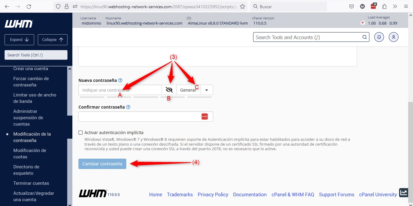 Once you have chosen the desired password, save the changes by clicking the button indicated in point (4).