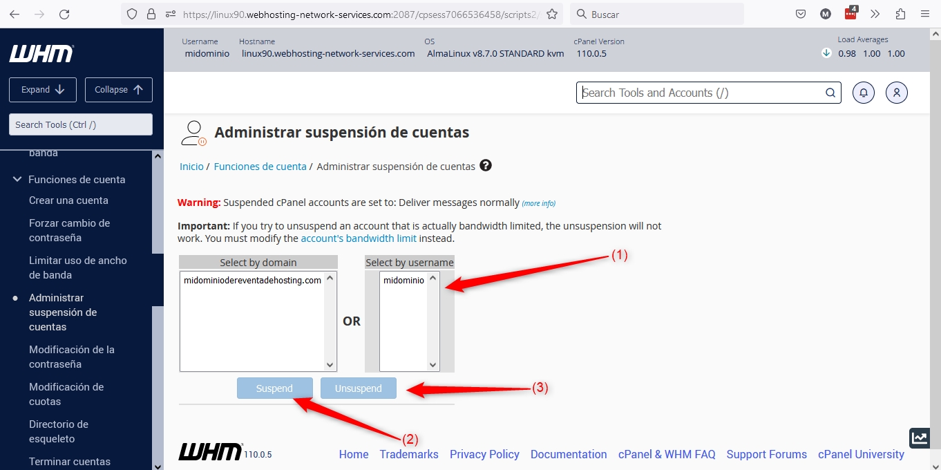 (1) => allows you to select the domain to suspend or unsuspend. You can search for it by domain name or cPanel username.