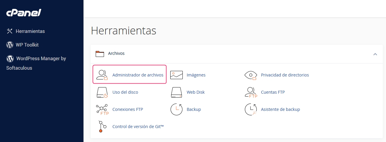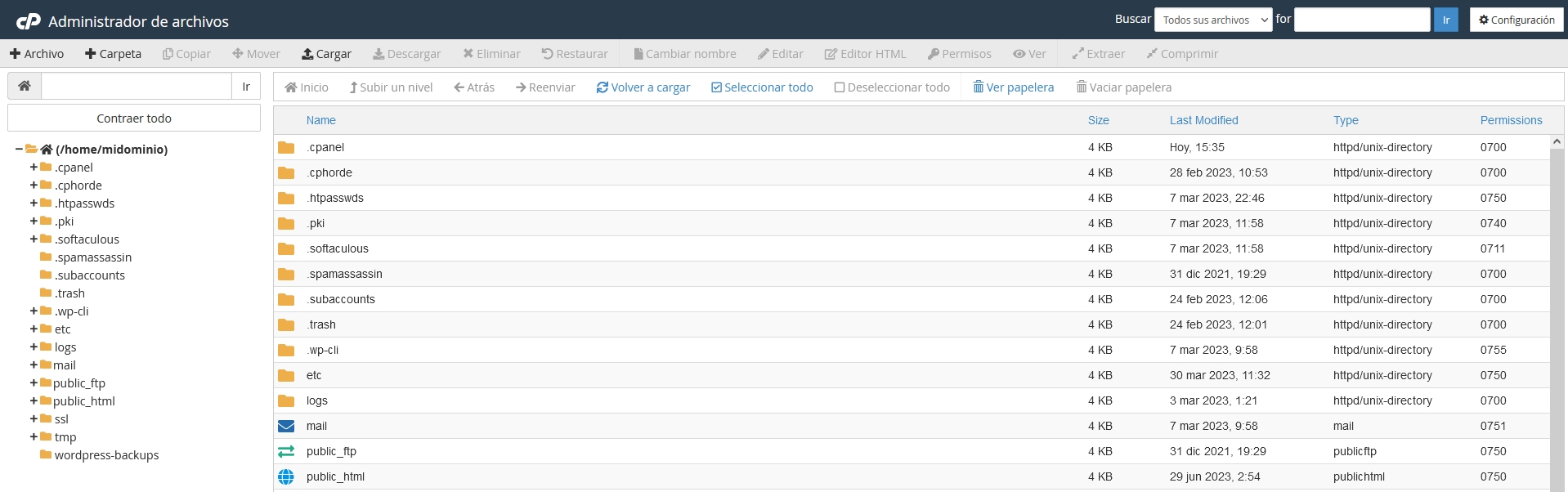 The File Manager is very similar to that of your operating system and will allow you to perform certain actions such as downloading and uploading files, editing them, compressing files and directories, changing permissions, protecting directory access with passwords, etc.