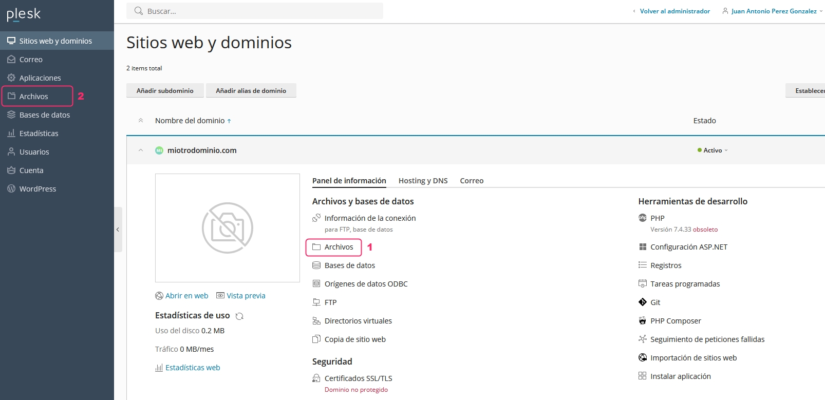 You will find the File Manager in the main screen of the control panel. You can access it from the Files button marked at point 1 or from the left menu, marked at point 2.