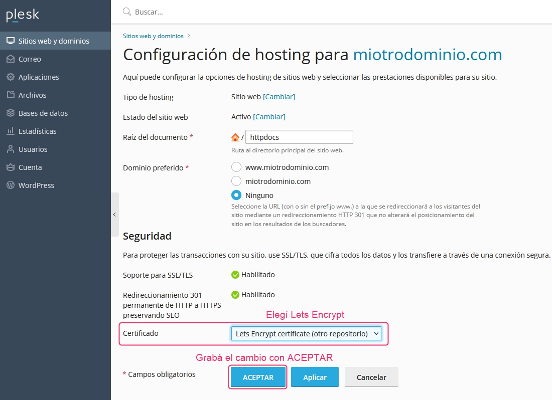 In the configuration screen, look for the Certificate dropdown menu and select Lets Encrypt.