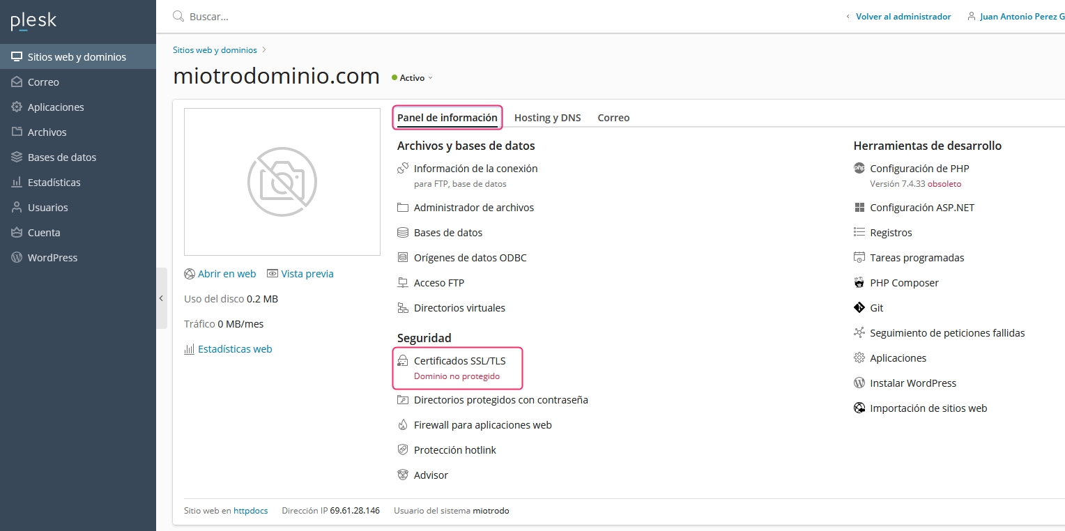 First, confirm the current status of your SSL coverage. From the Information Panel tab, select SSL/TLS Certificates option. Go in to see more details about the SSL certificate.