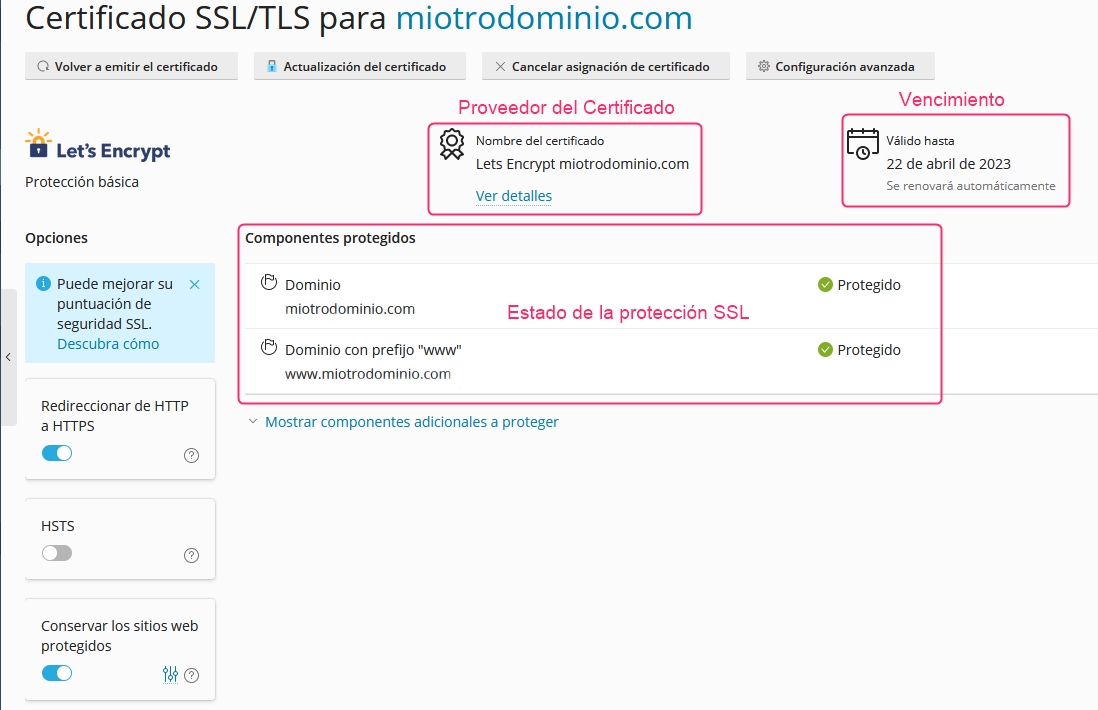 On the new screen, you will see the status of your coverage for each domain and subdomain, the expiration of the certificate, and the SSL certificate provider.