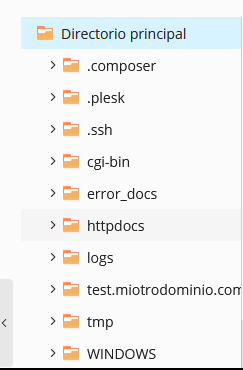 And this is an example of the directory structure in a Plesk account, where you will see the httpdocs directory.