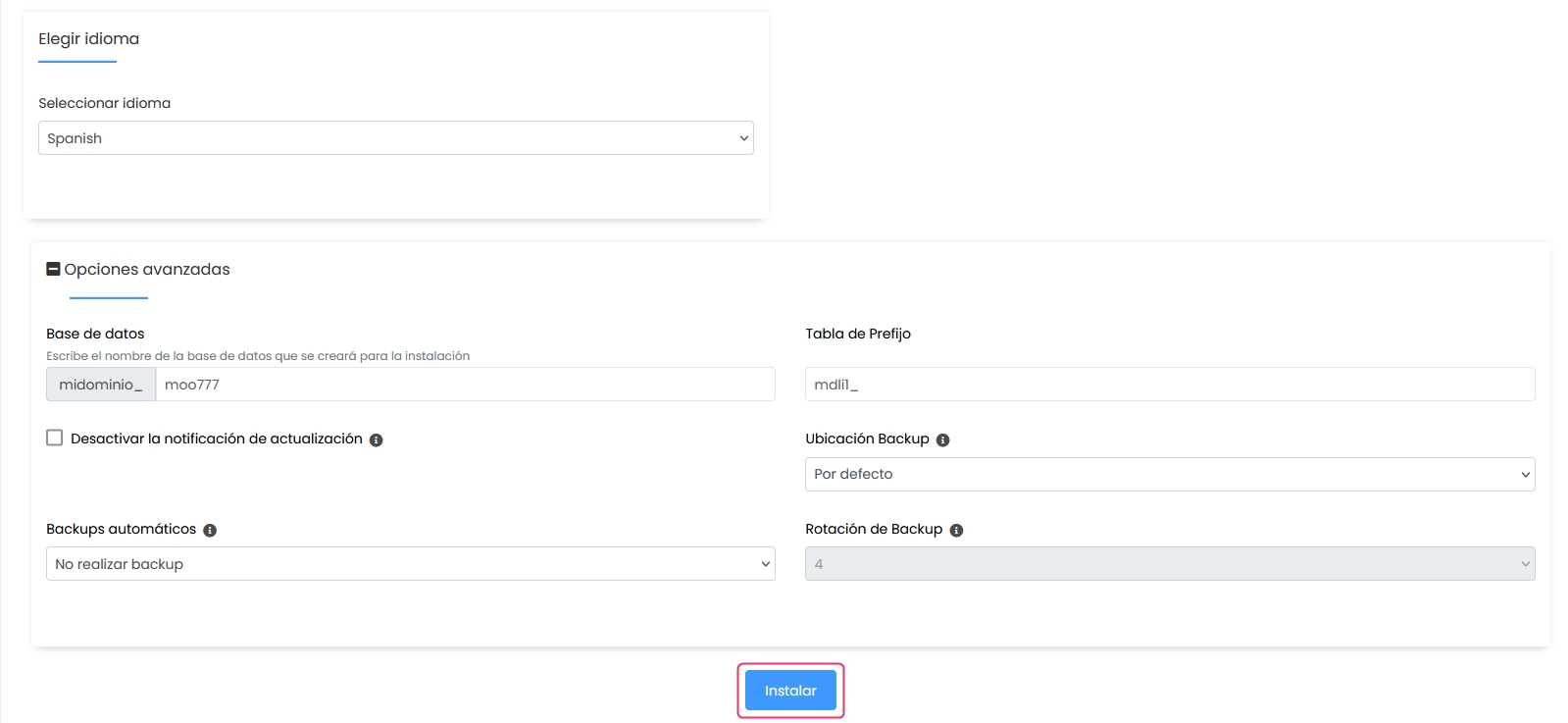 At the end of the installation data form, you will see the Install button to start the installation of the platform on your hosting plan.