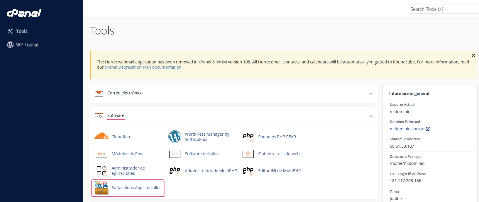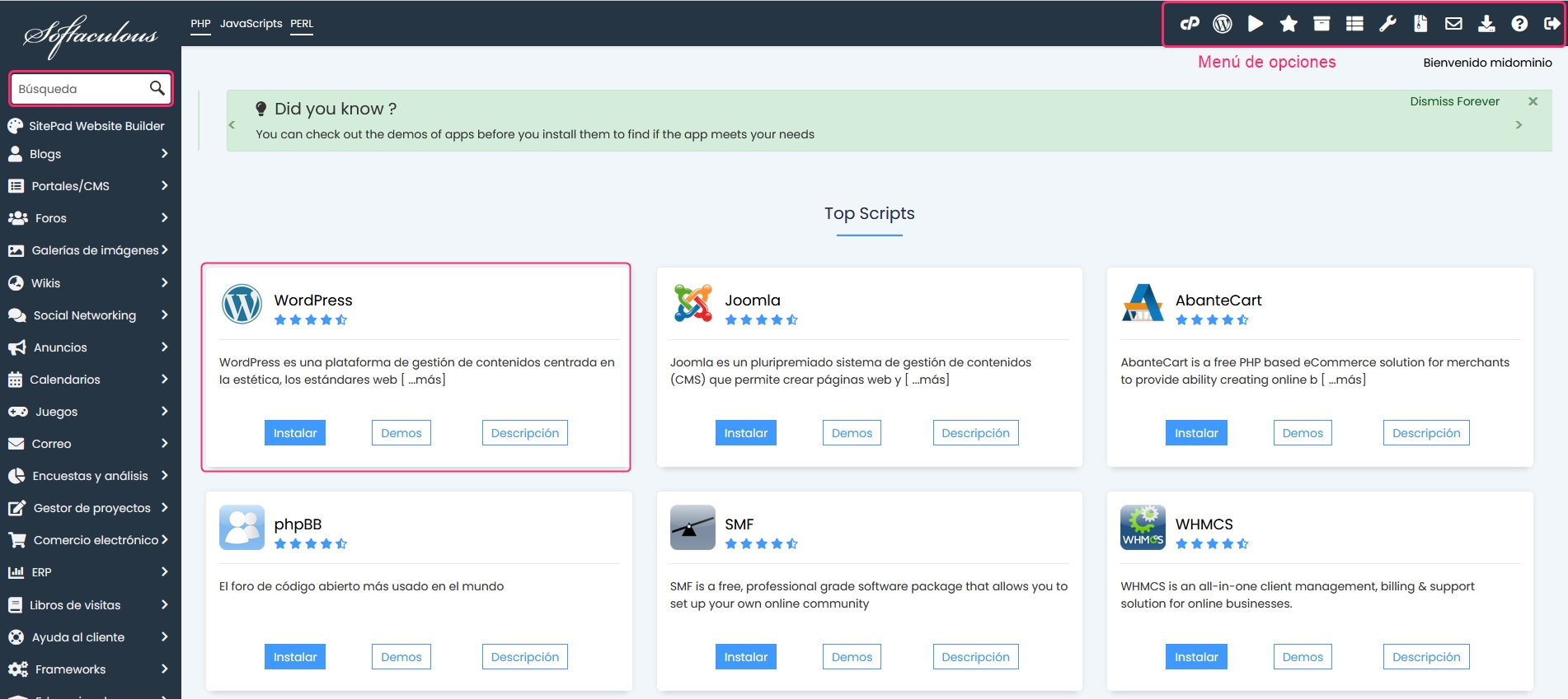 In Softaculous App Installer you will find a wide variety of tools, Apps, CMS, and modules to create your website. Follow these steps to install an application: