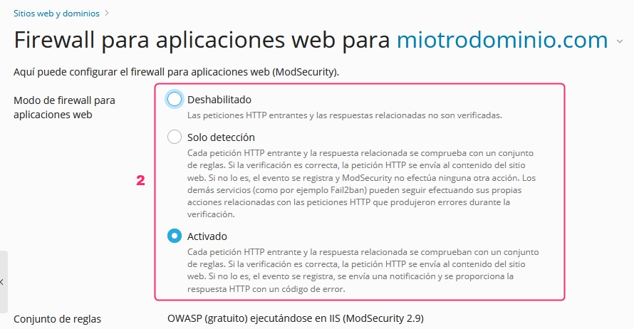 The first options will allow you to disable or enable ModSecurity or enable it in detection only mode. In this mode, it will generate detection logs but will not block the execution of the website.