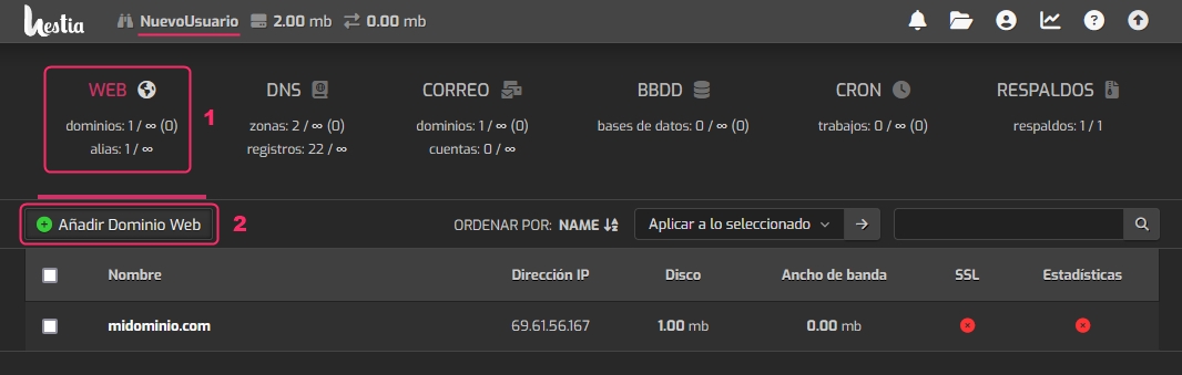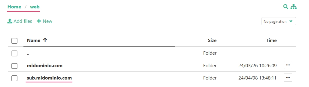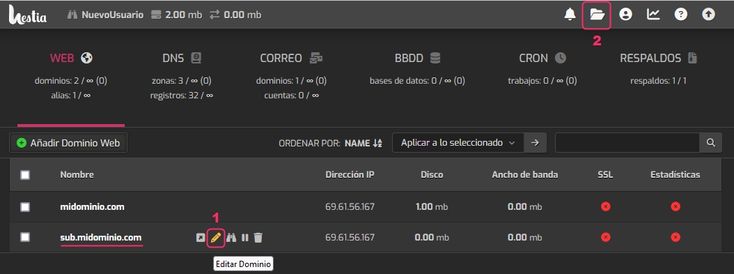 Returning to the main account screen, in the WEB section, you will see the new subdomain.