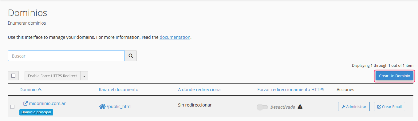 In the Domains screen, you will see the list of subdomains, aliases, or additional domains that you have created. At the top right, you will find the Create a Domain button to create them.