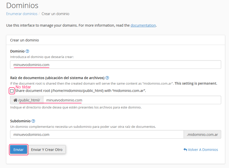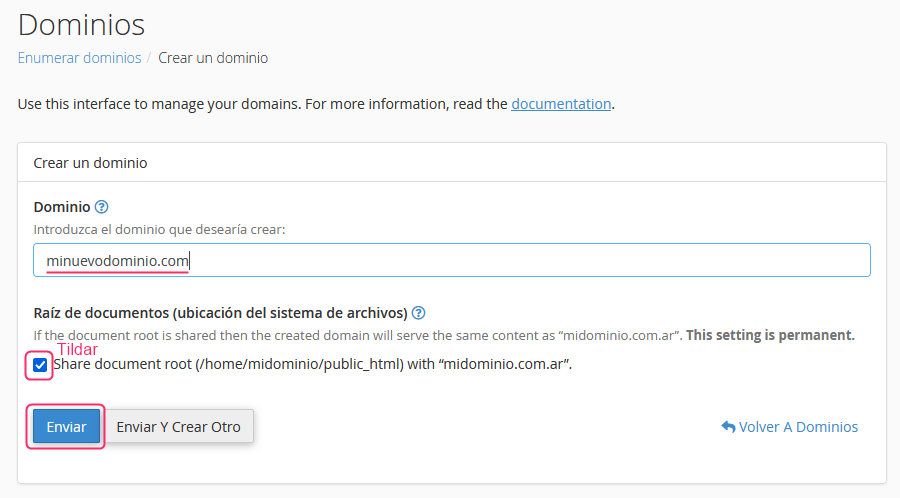 To create an Additional Domain, you need to enter the name of the new domain and uncheck the Share document root option. By doing this, the new domain will create a directory where the files of its website will need to be uploaded.